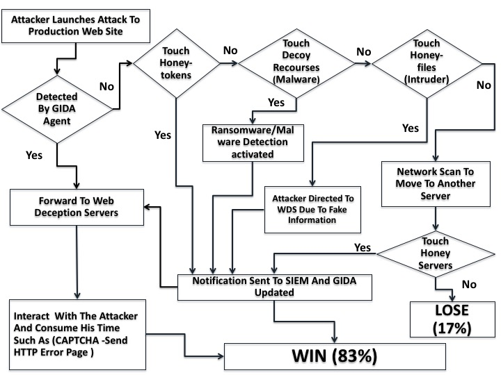 Web applications have many vulnerabilities that allow attackers to compromise sensitive data and gain unauthorized access to the production web servers. Compromised web-sessions represent a major threat. Current random attacks draw attention to the need for new protection and detection tools. In this paper, we propose a web deception scheme to mitigate web attacks in the production web site. The solution is more like a call for arms, using game theory, honeyweb, and honeytokens with ransomware and intrusion detection. The proposed scheme is explained in details as well as simulation results. ©