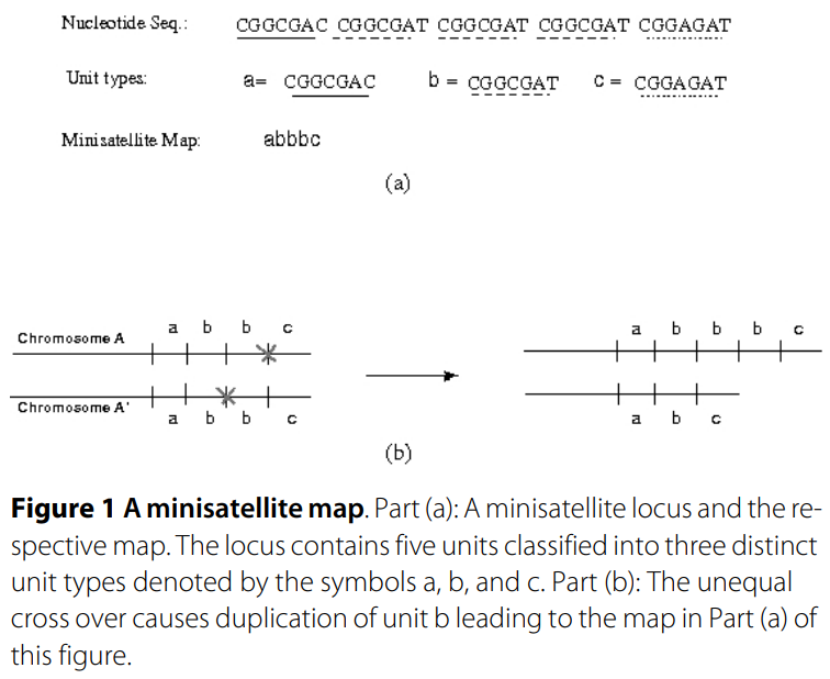 Background. Minisatellites are genomic loci composed of tandem arrays of short repetitive DNA segments. A minisatellite map is a sequence of symbols that represents the tandem repeat array such that the set of symbols is in one-to-one correspondence with the set of distinct repeats. Due to variations in repeat type and organization as well as copy number, the minisatellite maps have been widely used in forensic and population studies. In either domain, researchers need to compare the set of maps to each other, to build phylogenetic trees, to spot structural variations, and to study duplication