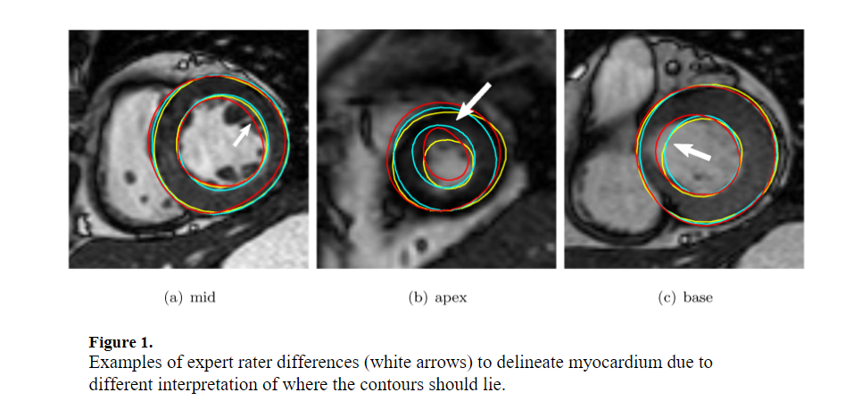 A collaborative framework was initiated to establish a community resource of ground truth segmentations from cardiac MRI. Multi-site, multi-vendor cardiac MRI datasets comprising 95 patients (73 men, 22 women; mean age 62.73. ±. 11.24. years) with coronary artery disease and prior myocardial infarction, were randomly selected from data made available by the Cardiac Atlas Project ( Fonseca et al., 2011). Three semi- and two fully-automated raters segmented the left ventricular myocardium from short-axis cardiac MR images as part of a challenge introduced at the STACOM 2011 MICCAI workshop (