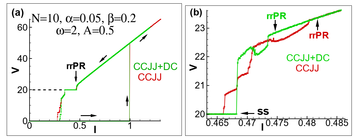 The effect of microwave irradiation on the phase dynamics of intrinsic Josephson junctions in high temperature superconductors is investigated. We compare the current-voltage characteristics for a stack of coupled Josephson junctions under external irradiation calculated in the framework of CCJJ and CCJJ+DC models.