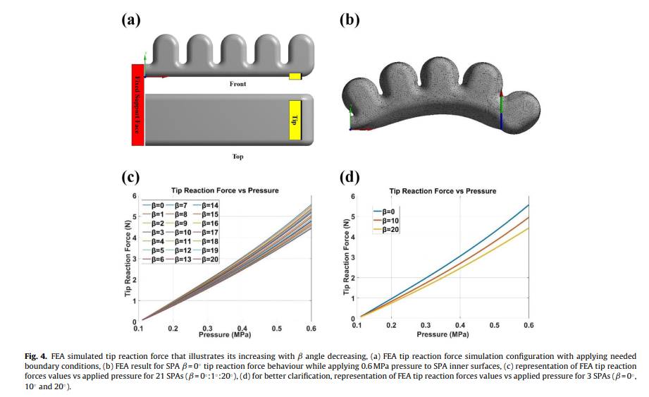In the last decade, soft robotics is considered one of the most widely researched fields in robotics, as it has many advantages and more versatile use than rigid robotics. Soft robots are flexible, which enable them to metaphorically complex designs, enabling them to imitate the movement of living things. In this article, the use of regression models with finite element analysis (FEA) data is compared with neural network (NN) models trained on visual feedback data. The effect of the soft pneumatic actuator (SPA) air pillow inclination angle (β) under positive and vacuum pressure on the