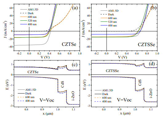 Current-voltage analysis using different optical band pass filters has been performed on Cu2ZnSnSe4 and Cu2ZnSn(S,Se) 4 thin-film solar cells. When using red or orange light (i.e. wavelengths above 600 nm), a distortion appears in the I-V curve of the Cu 2ZnSnSe4 solar cell, indicating an additional potential barrier to the current flow in the device for these conditions of illumination. This barrier is reduced when using a Cu2ZnSn(S,Se)4 absorber. Numerical simulations demonstrate that the barrier visible under red light could be explained by a positive conduction band offset at the front