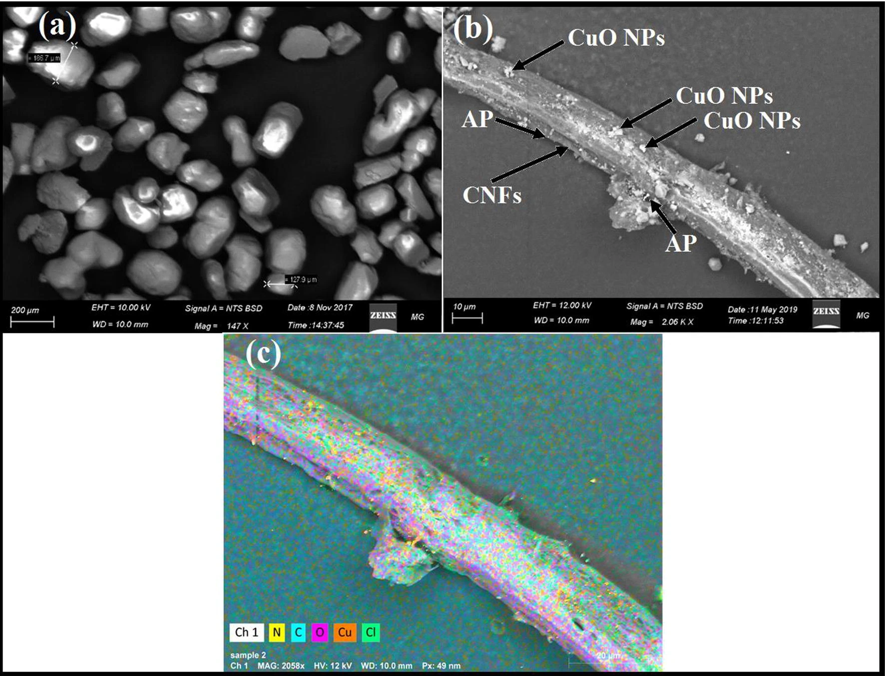Carbon nanofibers (CNFs) possess superior catalytic abilities and high surface area. Moreover, energetic particles can be loaded on them by acting as carriers. The current study reports an electroless plating, effective deposition of copper particles (Cu) on the surface of CNFs. The prepared Cu–CNFs hybrid was annealed at 250 °C to form CuO–CNFs. Homogeneous loading of CuO particles on CNFs was revealed via TEM analysis, while the crystalline structure was studied using XRD analysis. In addition, ammonium perchlorate (AP) oxidizer with endothermic initial decomposition was mixed with the