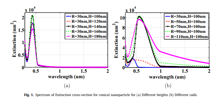 Plasmonic photovoltaics (PVs) are promising structures that improve thin-film photovoltaics performance, where optical absorption is improved via embedding metallic nanoparticles in the PV's active layer to trap the incident optical wave into the photovoltaic cell. The presented work investigates the design of PV with both structures of conical and cylindrical metallic nanoparticles through studying their extinction cross-sections and electric field distributions. Also, the impact of these nanoparticles in silicon PVs on the optical absorption enhancement is investigated. The figure of merit
