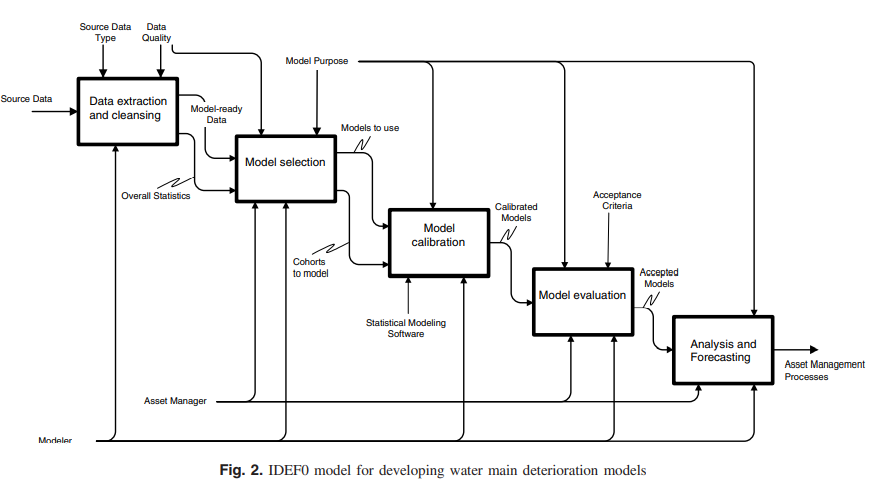 The use of water main break history as a proxy for condition has become common practice because of the high costs associated with direct assessments. Statistical deterioration models predict future water main breaks on the basis of historical patterns. Many municipalities are beginning to understand the value of utilizing water pipe break histories to manage their noncritical distribution networks via deterioration models. This paper presents a generic IDEF0 process model for developing water main deterioration models. Two common statistical deterioration models for water pipes are compared