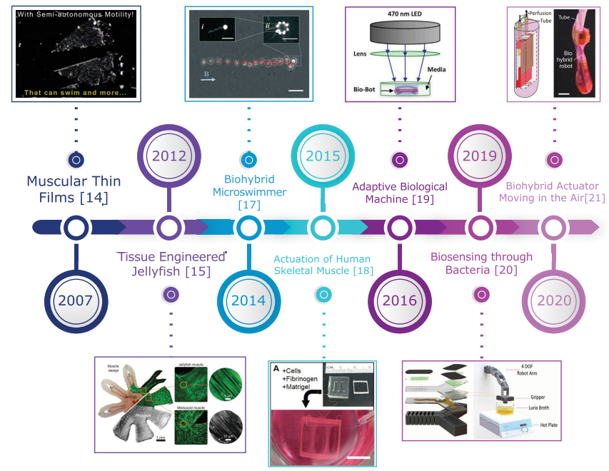 Soft Robotics is a new approach towards better human-robot interaction and biomimicry in the robotics field. Its integration with biological materials (Biohybrid soft robotics) is one of the topics being focused on in the soft robotics research in the last fifteen years. The motive for this approach is to combine the best of biological and artificial systems. In this article, Biohybrid soft robots and Electronic Skin (E-skin), which is considered one of the advances of soft robotics, are reviewed. Their most significant milestones and the highlights of their most researched applications are