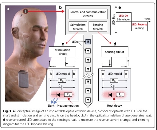 Background: One of the major concerns in implantable optoelectronics is the heat generated by emitters such as light emitting diodes (LEDs). Such devices typically produce more heat than light, whereas medical regulations state that the surface temperature change of medical implants must stay below + 2 °C. The LED's reverse current can be employed as a temperature-sensitive parameter to measure the temperature change at the implant's surface, and thus, monitor temperature rises. The main challenge in this approach is to bias the LED with a robust voltage since the reverse current is strongly