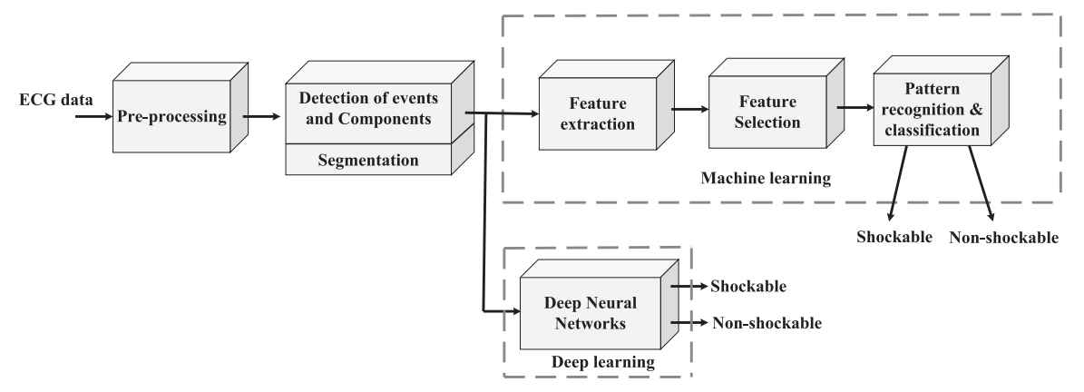 Sudden cardiac death from lethal arrhythmia is a preventable cause of death. Ventricular fibrillation and tachycardia are shockable electrocardiographic (ECG)rhythms that can respond to emergency electrical shock therapy and revert to normal sinus rhythm if diagnosed early upon cardiac arrest with the restoration of adequate cardiac pump function. However, manual inspection of ECG signals is a difficult task in the acute setting. Thus, computer-aided arrhythmia classification (CAAC) systems have been developed to detect shockable ECG rhythm. Traditional machine learning and deep learning