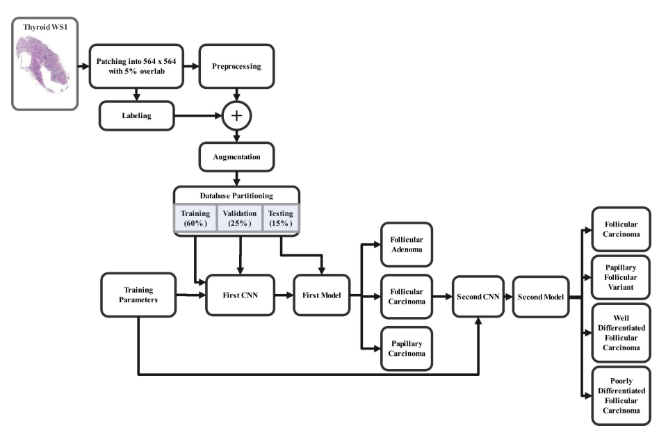 The objective of this research is to build a 'Whole Slide Images' classification system using Convolutional Neural Network (CNN). This system is capable of classifying Thyroid tumors into three types: Follicular adenoma, follicular carcinoma, and papillary carcinoma. Furthermore, the cascaded CNN technique is additionally employed to classify the classified follicular carcinoma into four subclasses: follicular carcinoma, papillary follicular variant, well-differentiated follicular carcinoma, and Poorly-differentiated follicular carcinoma. Results of the proposed CNN architecture showed