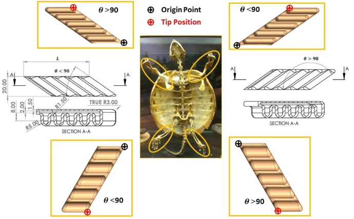 Advances of soft robotics enabled better mimicking of biological creatures and closer realization of animals’ motion in the robotics field. The biological creature’s movement has morphology and flexibility that is problematic deportation to a bio-inspired robot. This paper aims to study the ability to mimic turtle motion using a soft pneumatic actuator (SPA) as a turtle flipper limb. SPA’s behavior is simulated using finite element analysis to design turtle flipper at 22 different geometrical configurations, and the simulations are conducted on a large pressure range (0.11–0.4 Mpa). The
