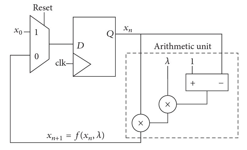 Chaotic systems appear in many applications such as pseudo-random number generation, text encryption, and secure image transfer. Numerical solutions of these systems using digital software or hardware inevitably deviate from the expected analytical solutions. Chaotic orbits produced using finite precision systems do not exhibit the infinite period expected under the assumptions of infinite simulation time and precision. In this paper, digital implementation of the generalized logisticmap with signed parameter is considered. We present a fixed-point hardware realization of a Pseudo-Random